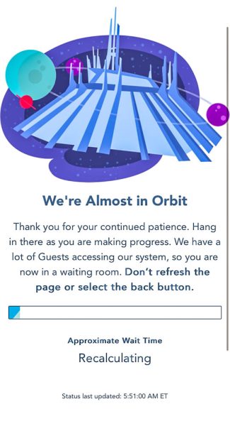 Even though they’d previously seen an updated approximate wait time (ranging from 10 minutes to “more than an hour”), our team members reported that it was updated to say “Recalculating.” It’s possible that there were too many people attempting to book their 2024 vacations, so the website was at capacity and could not allow more people in.