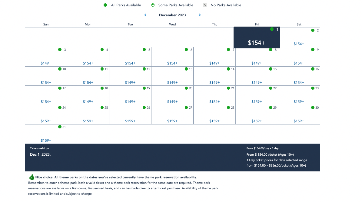 Again, pricing for each park will depend on the day and park you’ll be visiting. So Christmas Day in 2023 is priced as follows: $159 for Animal Kingdom, $179 for Hollywood Studios, $179 for EPCOT, and $189 for Magic Kingdom.