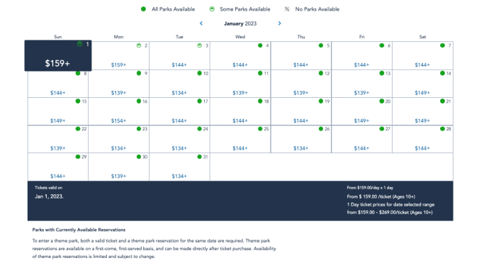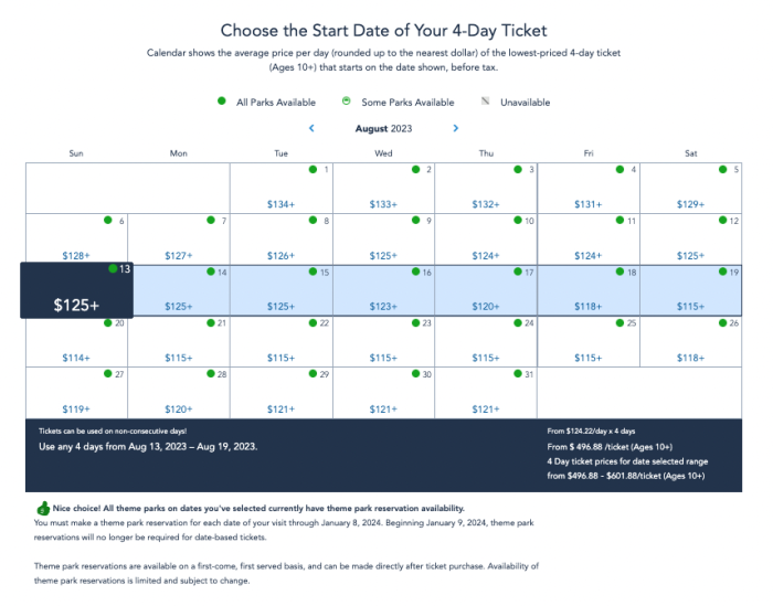 Again, remember this is just a decrease in the STARTING price per day. So, for example, August 28th, 2023 starts at $134+. Ticket prices break down to $134 for Animal Kingdom, $144 for Hollywood Studios, $134 for EPCOT, and $149 for Magic Kingdom.