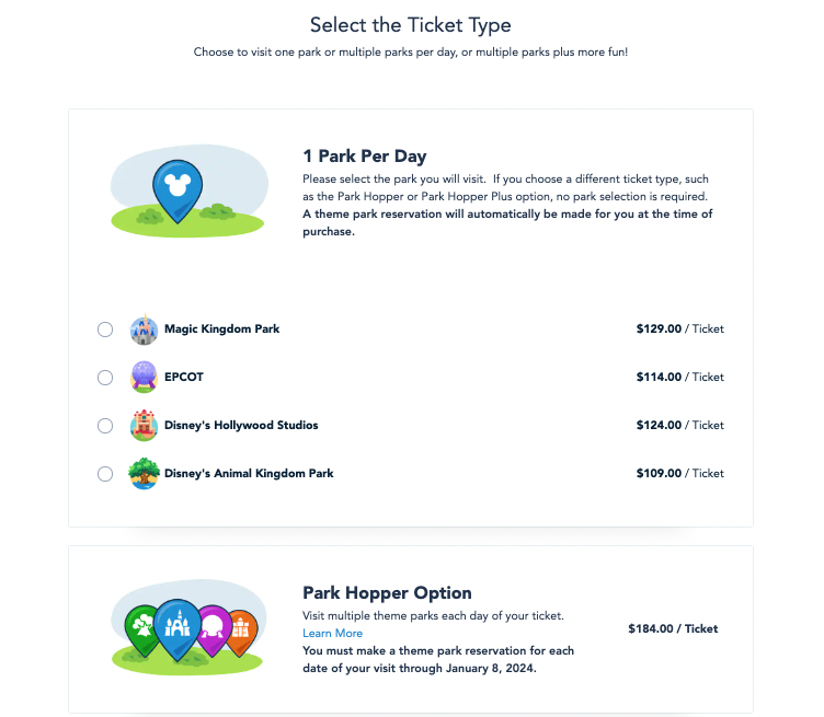 Again, this will all vary depending on the date you choose to visit since Park Hopper costs and 1-day ticket prices are date-specific now. But be aware that just because a starting price might be the same between 2023 and 2024, it doesn’t mean that tickets for ALL parks on that date will be the same price, and it doesn’t mean Park Hoppers will be the same price either.