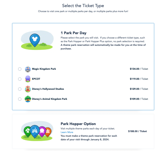 …versus $188 in 2024. That’s an increase of $4, which makes sense because you’ll see that ticket prices for all parks (except Animal Kingdom) also increase on that date in 2024 (but because Animal Kingdom’s price is the same, the “starting price” for both is the same).