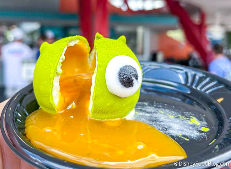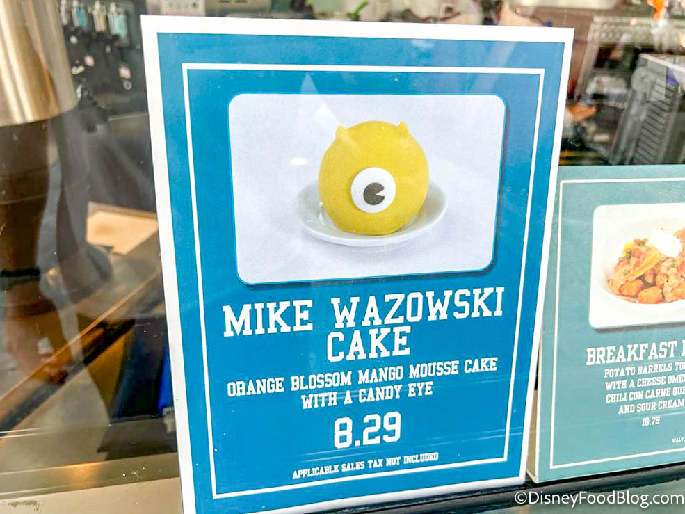 Introducing the NEW Mike Wazowski CAKE! We first shared the news about this little creature a few days ago, but now he is HERE. The treat itself is an Orange Blossom Mango Mousse Cake with a Candy Eye, priced at $8.29. And while the image of this snack had us VERY excited, our snack experience was…interesting, to say the least.