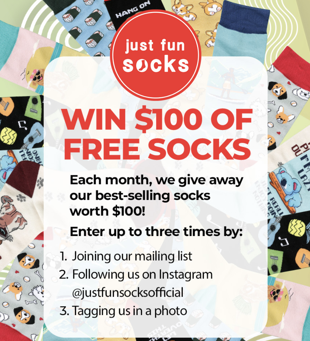 Just Fun Socks at Disney Springs has a sweepstakes going on that will have your feet dancing to a happy beat! Right now, you have the chance to win $100 of free socks.