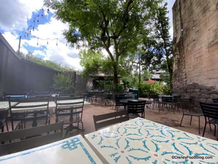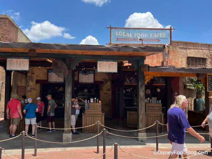 Seating is outdoors with some tables covered by canvas umbrellas. But because it is located close to two of Animal Kingdom’s most popular attractions — Expedition Everest and Kali River Rapids — it can get busy during peak times. Still, we think it’s a good option for a satisfying and quick meal.