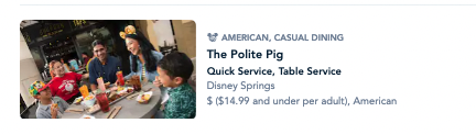 Note that Disney’s website seems to list The Polite Pig as Quick Service and Table Service, though it does NOT truly offer a Table Service option. We anticipate that the entrees below will be included in the Quick Service Dining Plan, but it’s possible Disney may make a change there. Be sure to check and see what is available to order on the Quick Service plan when you visit.