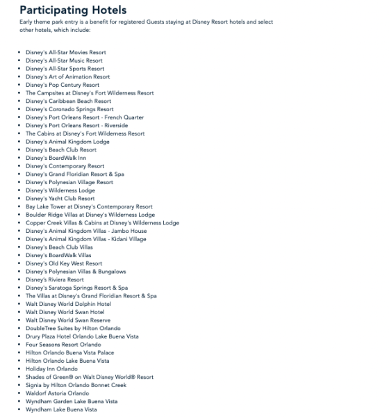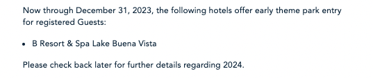 Guests staying at other Disney Springs-area hotels also get Early Theme Park Entry through the end of 2023, but they have not yet been confirmed to receive that perk for 2024. Disney suggests guests check back later to see which hotels will have Early Theme Park Entry for 2024.