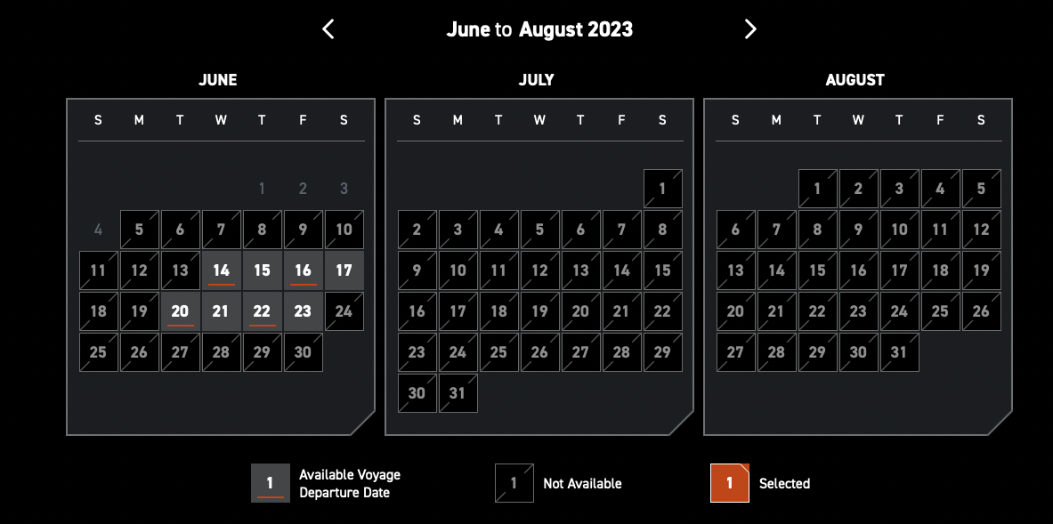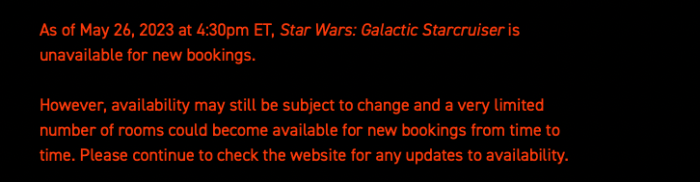 When we visited the Star Wars Hotel website today, we noticed something interesting. VERY limited availability appears to have popped up for select dates in June 2023. It looks like 4 voyage departure dates are now available for booking again.