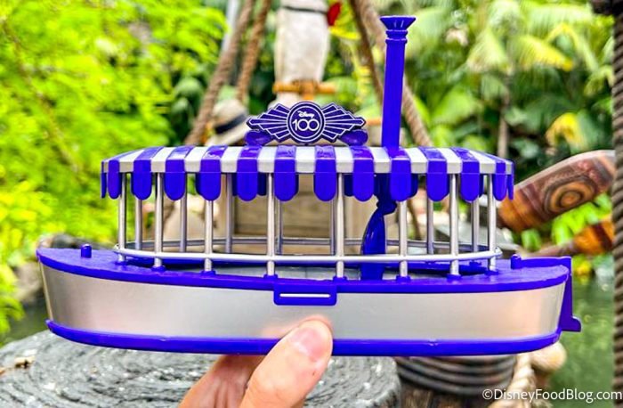 The boat looks just like its bigger counterparts that take guests to the Back Side of Water every day with one fancy addition: there’s a Disney100 medallion on top of it! It’s also in the 100th anniversary colors: purple and platinum. How would you like to take a cruise through the Amazon in this boat, huh?