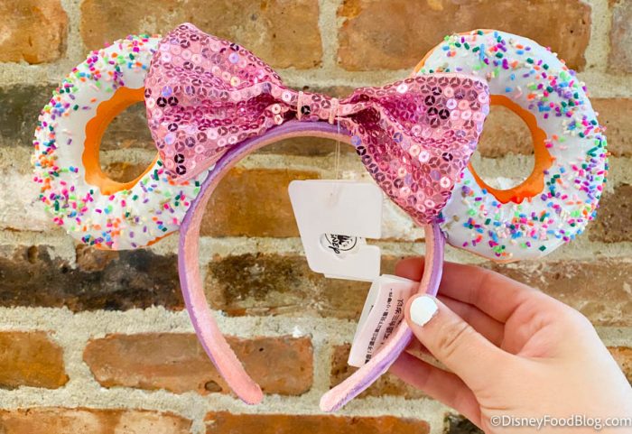 These Donut Minnie Ears could be the perfect addition to any park outfit! The ears themselves look just like donuts covered in white frosting and sprinkles. Plus, there’s even a big pink sequined bow!