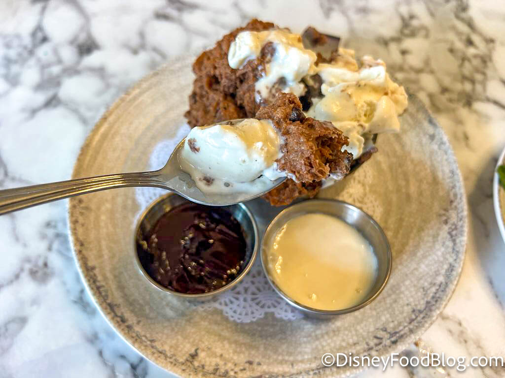 The ice cream melted into the bread pudding to add a vanilla flavor throughout, but you could get more rich chocolate flavors if you used the sauces that came along. We liked this a LOT!