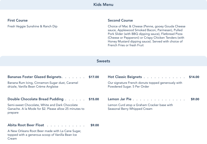 And of course, you can finish off your meal with a selection of desserts. They have Bananas Foster Glazed Beignets, Double Chocolate Bread Pudding, Lemon Jar Pie, Hot Classic Beignets, and an Abita Root Beer Float.