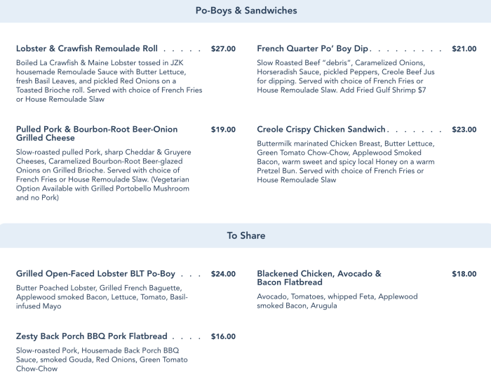 The menu is inspired by both Louisiana and coastal flavors, and you’ll see that evident in the options available. There are several different Po-Boys and sandwiches on the menu, including a French Quarter Po’ Boy Dip or a Lobster & Crawfish Remoulade Roll.