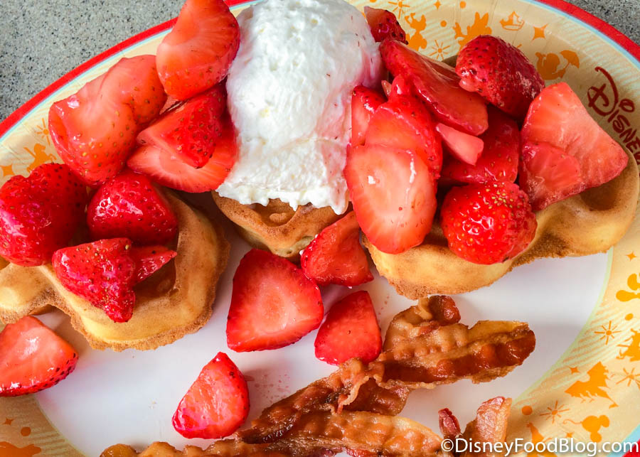 You’ll get a family-style platter of Cinnamon Breakfast Loaf, Smoked Bacon, Fruit, Eggs, Mickey-shaped Waffles, and more. You can keep asking for more and more until you absolutely cannot eat another bite, though, which is the best part.