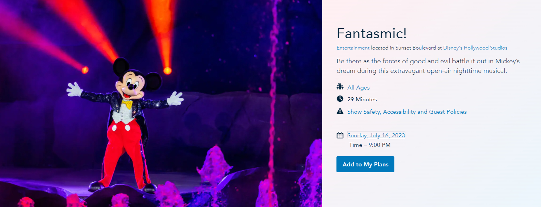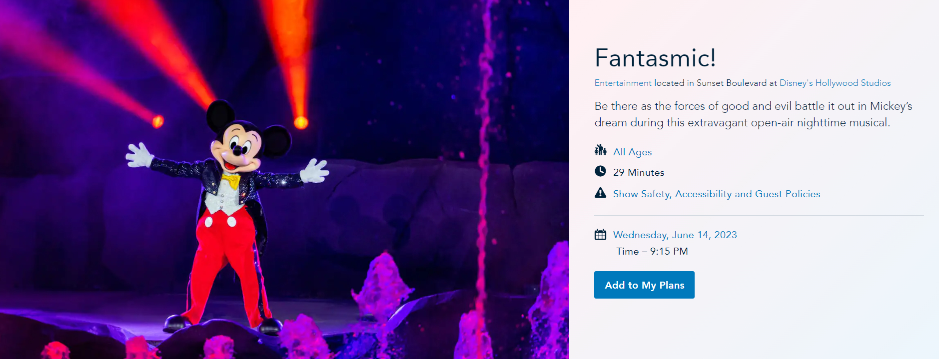 From June 14th through July 15th, the showtime for Fantasmic! will change to 9:15PM.
