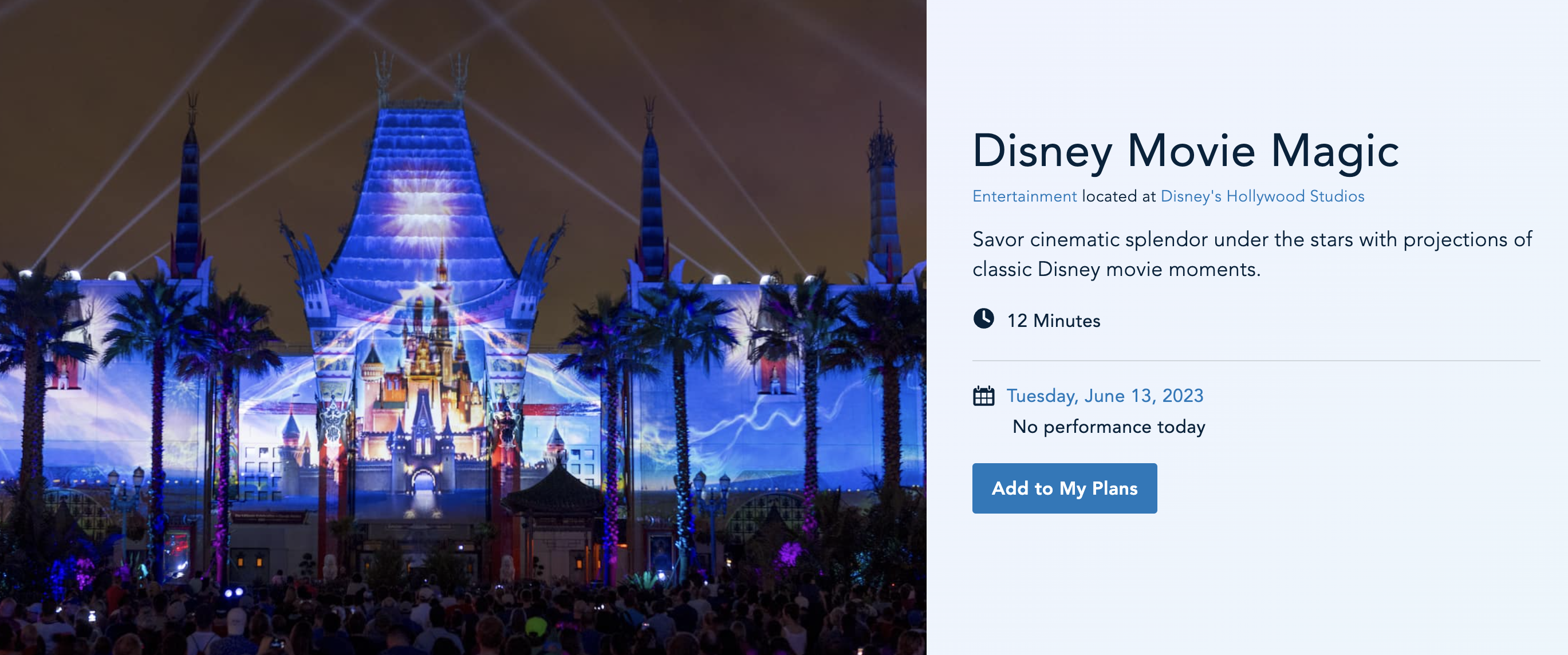 Oddly enough, it does appear that Disney Movie Magic will still be shown during After Hours events at Hollywood Studios — but if you haven’t already purchased your ticket for that, you’re out of luck as they’ve been sold out for a bit.