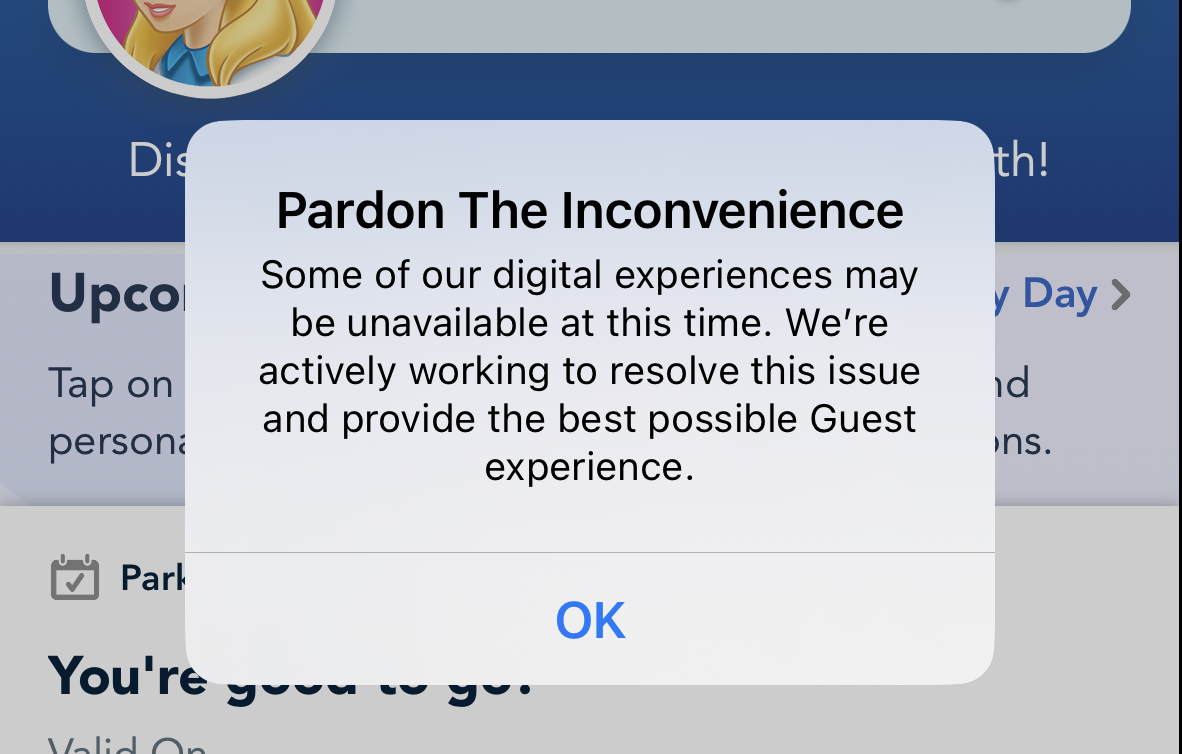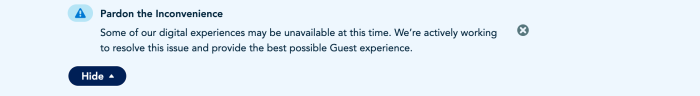 And, it also looks like the issues are potentially affecting the My Disney Experience app as well. We received a pop-up when we opened the app letting us know that some services may be unavailable.