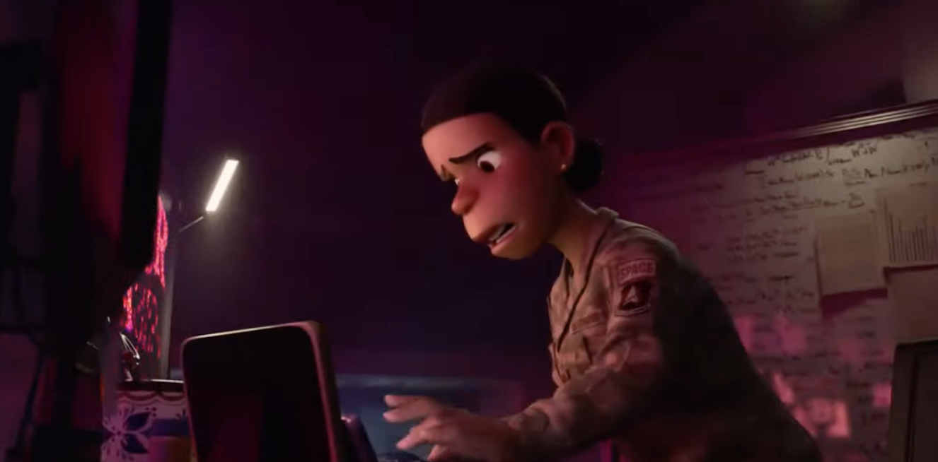 The movie features young Elio Solis, voiced by Yonas Kibreab, and his mother, Olga, who is voiced by America Fererra. Olga runs a top-secret military project and works hard to interpret a code she’s receiving from somewhere in space.