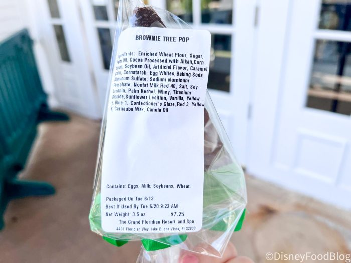This cute treat is priced at $7.25 and is returning offering from the annual Grand Floridian Resort & Spa Gingerbread House. This one is made of a chocolate brownie that’s partially dipped in green-colored white chocolate and topped with a white chocolate drizzle and rainbow sprinkles. Here’s a quick peek at the label from the backside of the wrapping.