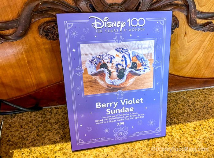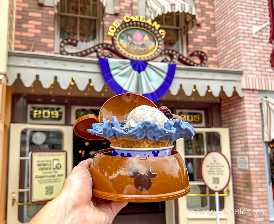 Come check out the Berry Violet Sundae with us at Gibson Girl Ice Cream in Disneyland! It’s made with two scoops of vanilla ice cream, topped with mixed berry sweet-cream sauce, and served in a dipped waffle cup with sprinkles. You can get just the dessert for $7.99, or get it in a Mickey Ear Hat bowl for $17.19 (which is what we did)!