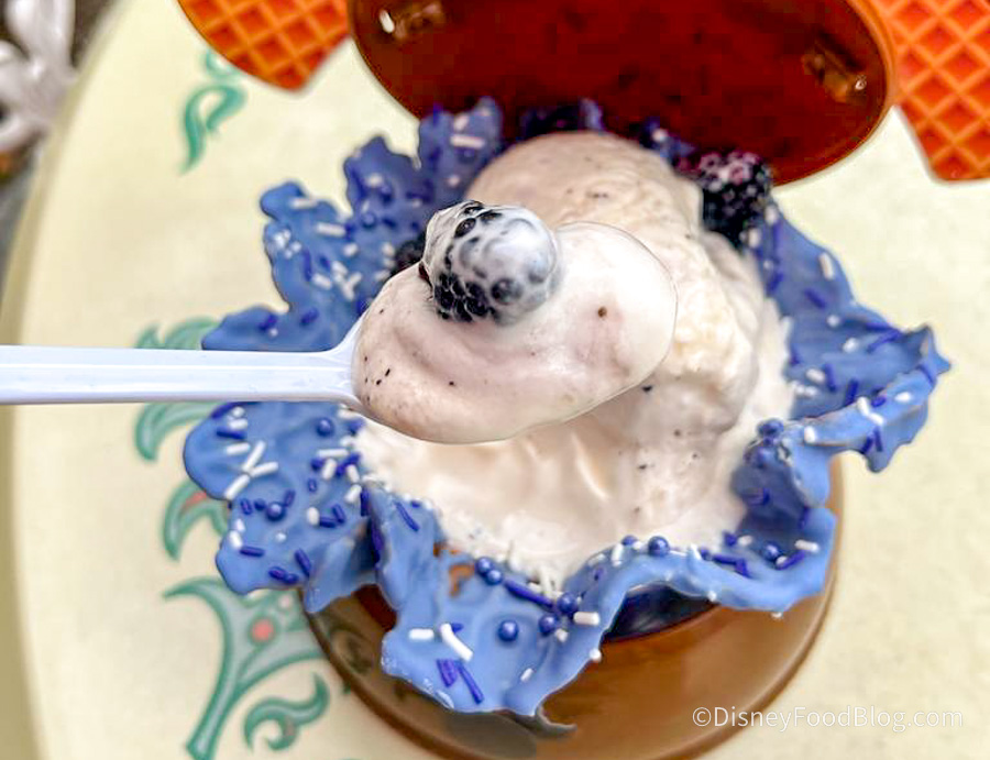 There were a few berries on top that helped cut down on some of the sweetness as they were on the tart side. This dessert was simple, sweet, and something we would definitely get again. Plus, we love adding to our Mickey Ear Hat bowl collection! Our only complaint is that there weren’t additional fresh berries on top! If you’re not a fan of fruity desserts or berries, we’d skip this one.