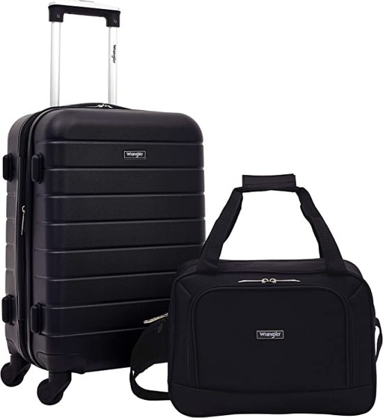 This set is built for durability. The hard luggage is made of ABS hard shell and the boarding tote is made of polyester material. It also features the patented 3-in-1 cup holder, USB port, and phone holder located in the back of luggage for travel convenience, double spinner wheels that allow complete 360-degree movement, expandable packing capacity, and comes with fully-lined interior with accessory pockets.