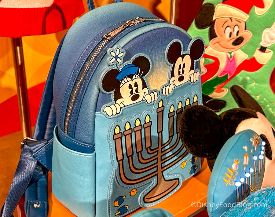 The accompanying Loungefly backpack also features a full Menorah with both Mickey and Mickey gazing on.