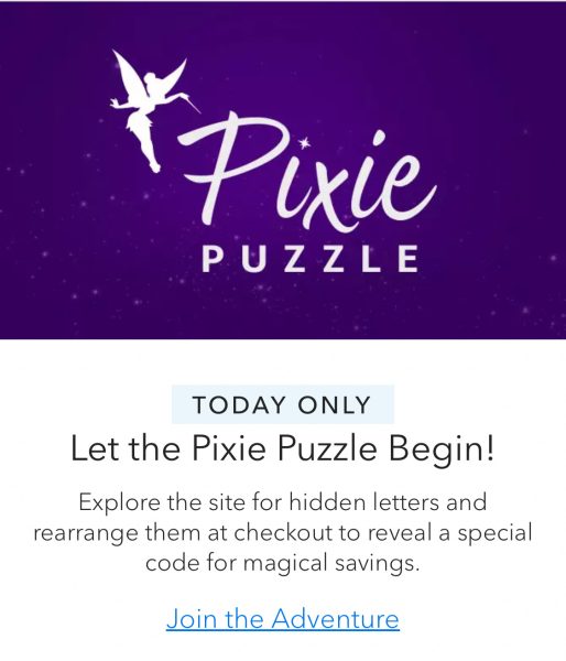 If you happen to find yourself browsing the offerings on shopDisney today, hunting down just the right Disney things to complete your collection, chances are you’ll probably run across this fun online scavenger hunt that unlocks an exclusive discount code. When we logged into shopDisney ourselves, we were greeted with an interactive way to browse the site and cash in on some stellar savings in the process. The first notice we saw looked like this. The puzzle begins here!