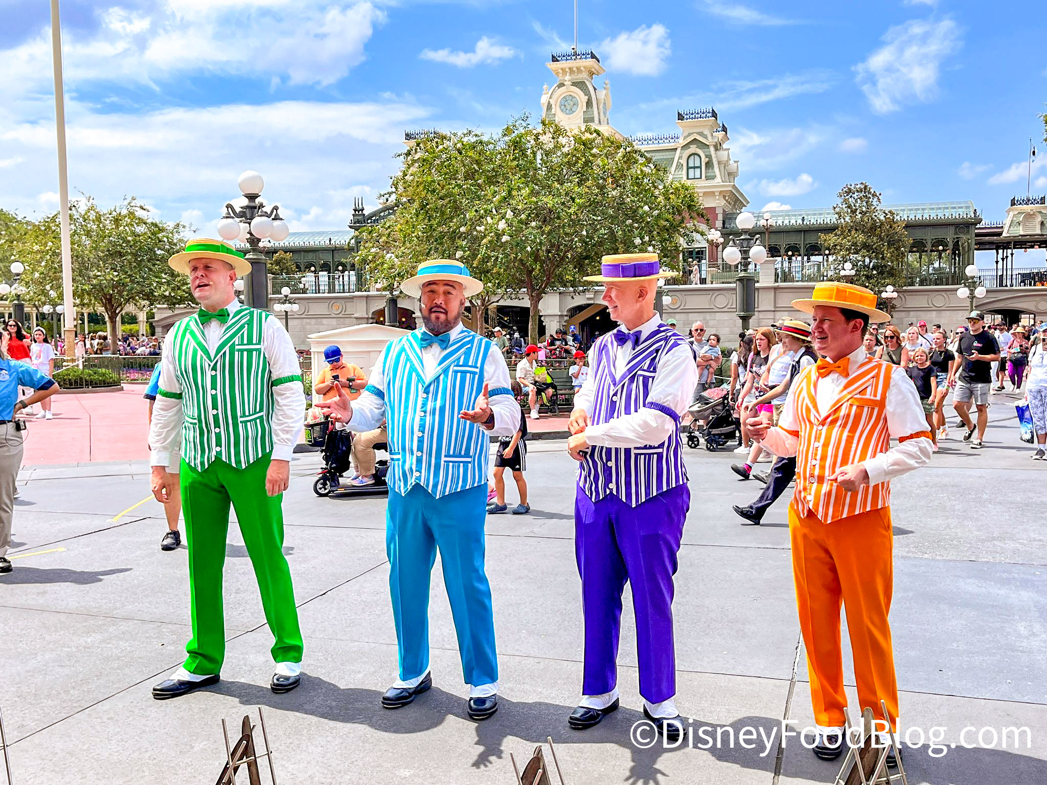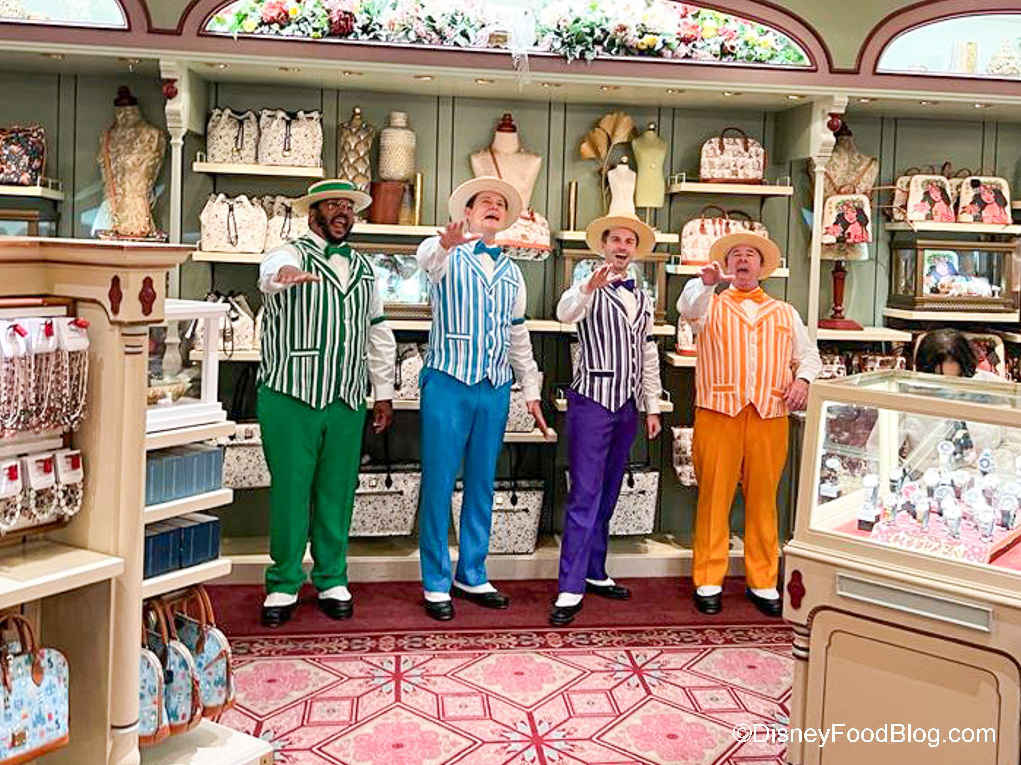 So we have to do a little bit of explaining here. The Dapper Dans normally appear on Main Street, U.S.A. throughout the day, performing live for Magic Kingdom visitors. Today, though, the weather was not so great, so that’s why we didn’t catch them OUTSIDE.