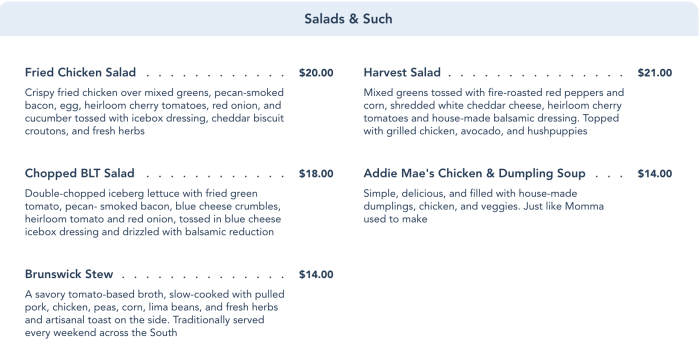 For those who want something lighter, the Salads & Such section has a Fried Chicken Salad, a Chopped BLT Salad, and even Addie Mae’s Chicken & Dumpling Soup. Plus, Brunswick Stew was added earlier this year.