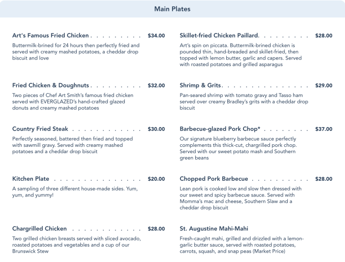 Now we make it to the Main Plates! Art’s Famous Fried Chicken is an iconic choice, or you could go for the new entree and get the Skillet-Fried Chicken Paillard. Fried Chicken & Doughnuts or the Kitchen Plate are good choices if you want to sample multiple items.