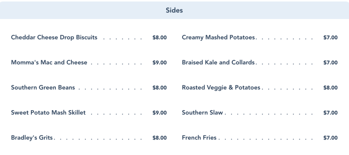 Homecomin’ is also known for its delicious sides, and there are plenty to choose from. Cheddar Cheese Drop Biscuits, Creamy Mashed Potatoes, Mac and Cheese, Southern Green Beans, and Bradley’s Grits are just a few of the options.