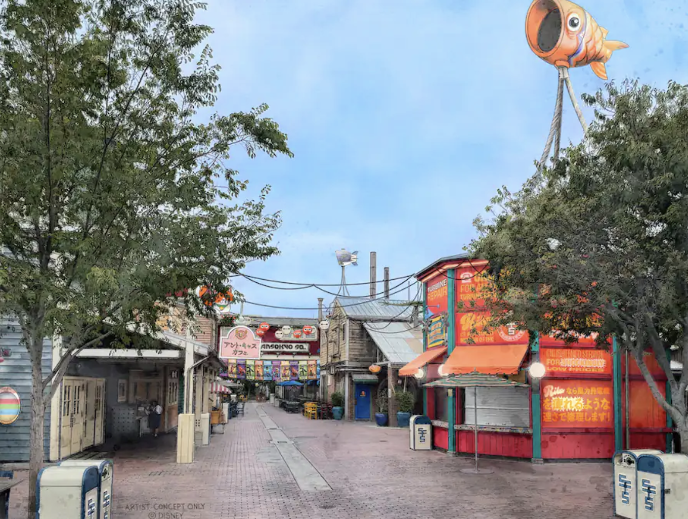 In the concept art for the area, you can see details themed to the movie, like market shelves “situated on robot storage cases, with decommissioned battle bots on display.” Up above, the local battlebot champion, Hiro’s Megabot, sits in the rafters!