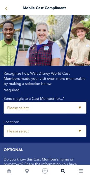 Want to know how to use the Cast Compliment feature? On the My Disney Experience app, you’ll want to click on the three lines at the bottom right of the home screen of the app and scroll down to “Cast Compliment.” (It’s close to the bottom of the menu.) Then you just select why you’re complimenting the Cast Member, their location, their name and hometown (if you know it), and the date of the interaction.