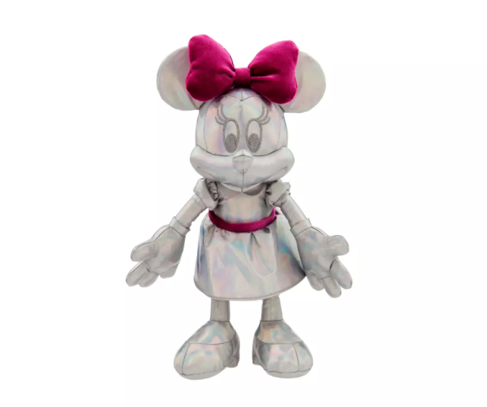 The Disney100 Platinum Loungefly Bag features classic Disney characters like Mickey Mouse, Donald, and Goofy in the Disney100 outfits. The Disney100 logo is also seen in the overall partner.Minnie Mouse Disney100 Plush
