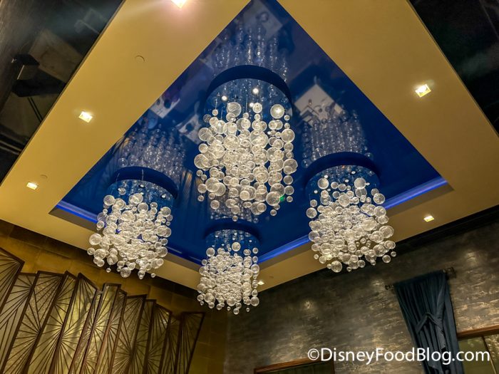 Once I got the text that my table was ready, I headed inside. The restaurant is stunning. It’s full of dark, moody blues and a mix of opulent white details that remind you of being under the sea.