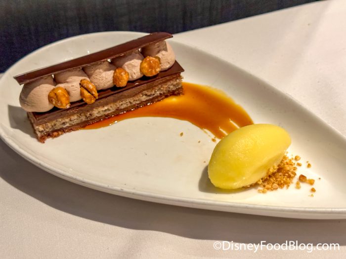 Lastly, I had the new Chocolate-Hazelnut Bar for dessert, which was a Hazelnut Dacquoise with Milk Chocolate Whipped Cream, Candied Hazelnuts, and Orange Sorbet. This dessert was enjoyable, but not necessarily something I would order again for $14.