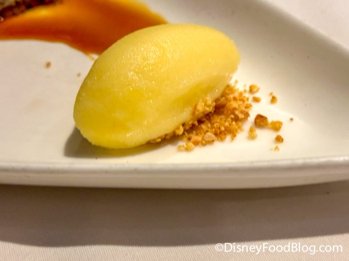 The orange sorbet was tasty but it was actually very tart! The orange sauce that it was served with was bold and tasted like orange liqueur reduction — think sweet but with a bite!