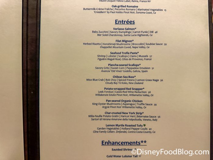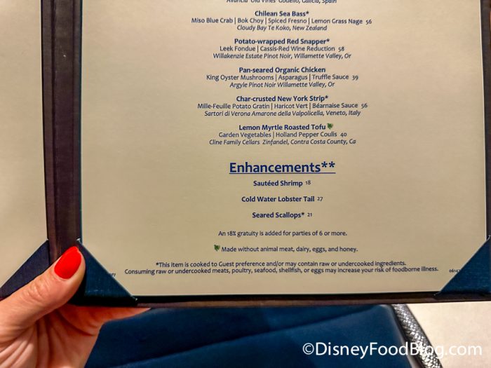 There are also enhancements you could add to your meal, like the Sauteed Shrimp, Cold Water Lobster Tail, and Seared Scallops.