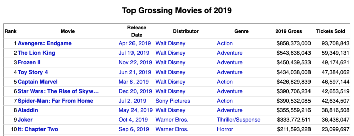 For example, Beauty and the Beast was the second-highest-grossing film in the year it was released, 2017. Similarly, in 2019, The Lion King was second only to Avengers: Endgame.