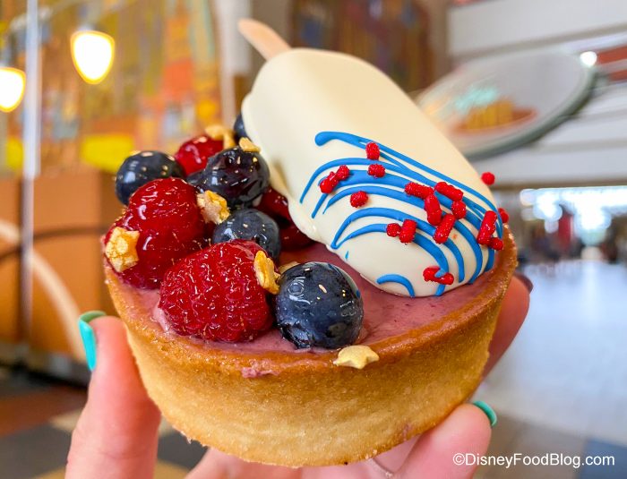 - Fourth of July Fruit Tart: Blackberry custard topped with fresh berries and a vanilla panna cotta popsicle