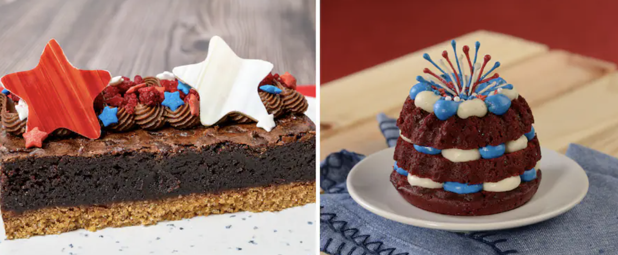 - Star-spangled Brownie Bar: Graham cracker crust and chocolate chip fudgy brownie topped with a brown butter caramel mousse, popping candy, and chocolate décor