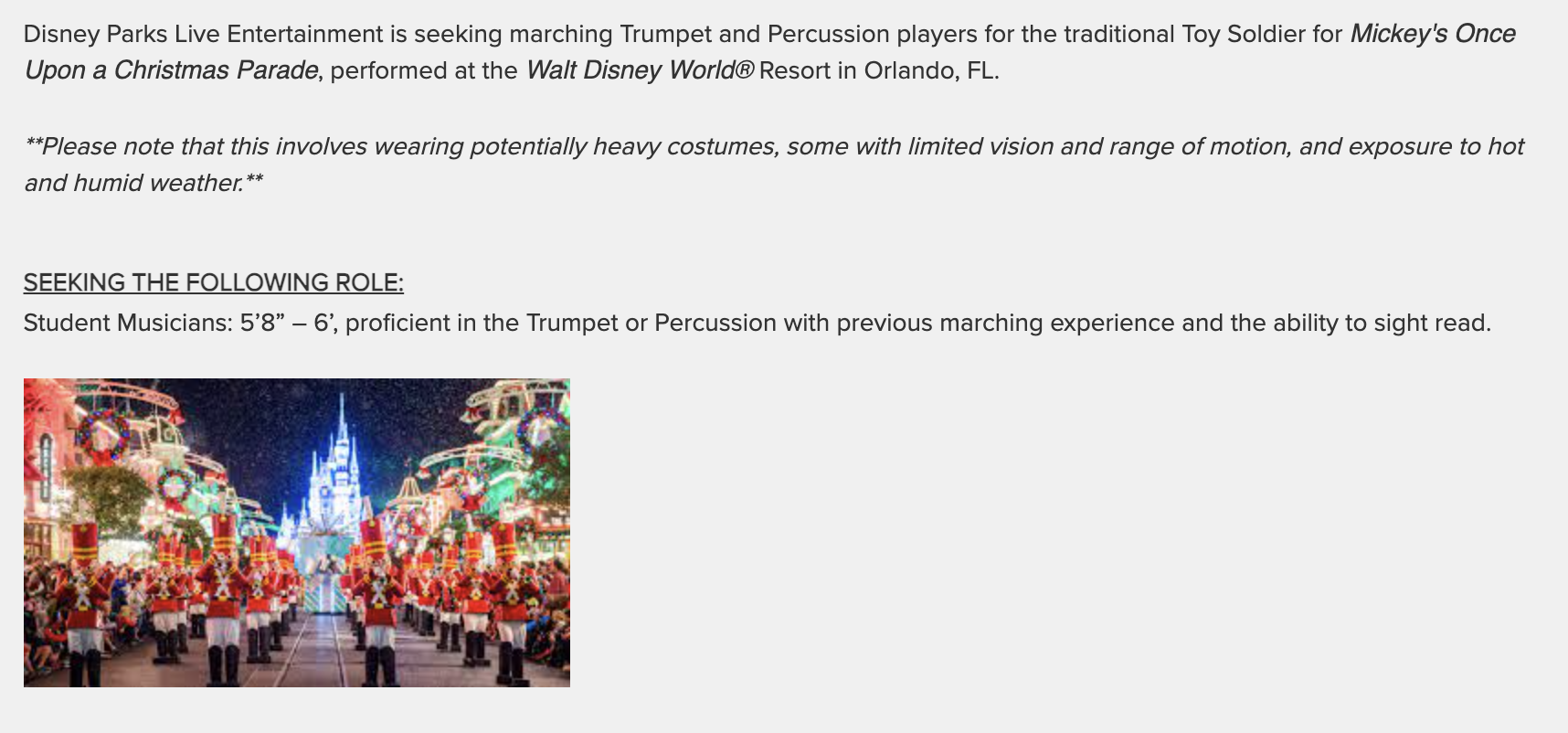 Over on the Disney Auditions website, we noticed an interested listing. We were intrigued by what the “Student Musicians” would be used for in Disney World, so we did some more investigating…