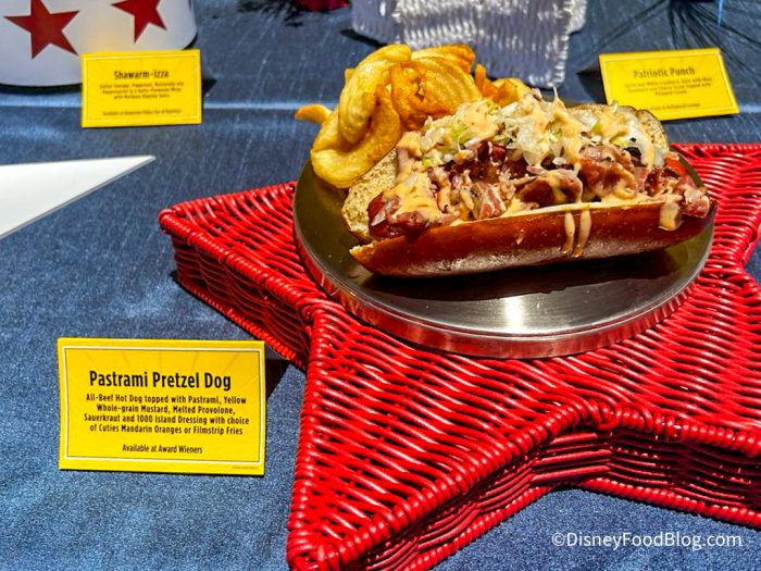 We also spotted the Cap’n Everything Dog, which will be available at the Outdoor Vending carts throughout the park. It’s made with a hot link wrapped in pizza dough, topped with everything bagel seasoning, and served with a side of mustard cheese sauce and potato chips.