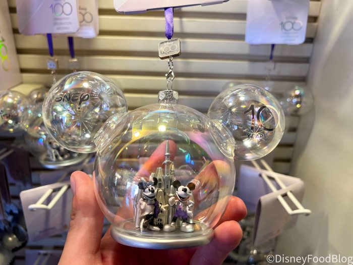 It’s never too early to start decorating for the holidays, and now is a perfect excuse to stock up on some new goods! Mickey and Minnie are dressed in their 100th anniversary best inside this globe ornament. Peep the castle in the back too!