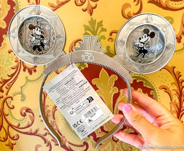 Today, we were browsing the merchandise in the Emporium (Magic Kingdom‘s huge gift shop on Main Street, U.S.A.) when we came across these beauties. This is the Disney100 Platinum Mickey and Minnie Ear Headband.