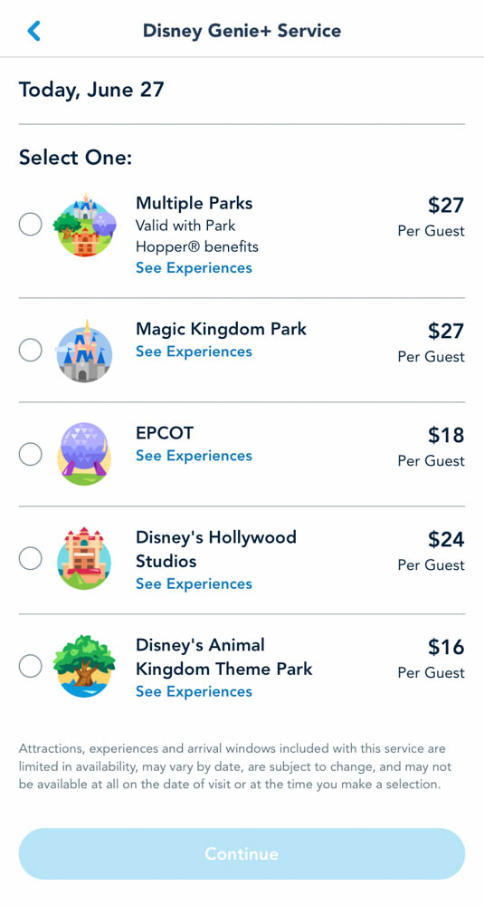 As of June 27th, Disney World’s Genie+ system is now a per-park, per-day service, meaning that the price will depend on which park you’re visiting, and you can select between skipping the lines for a single day or multiple days. Just like the old system, Genie+ is subject to availability, and the prices will vary.