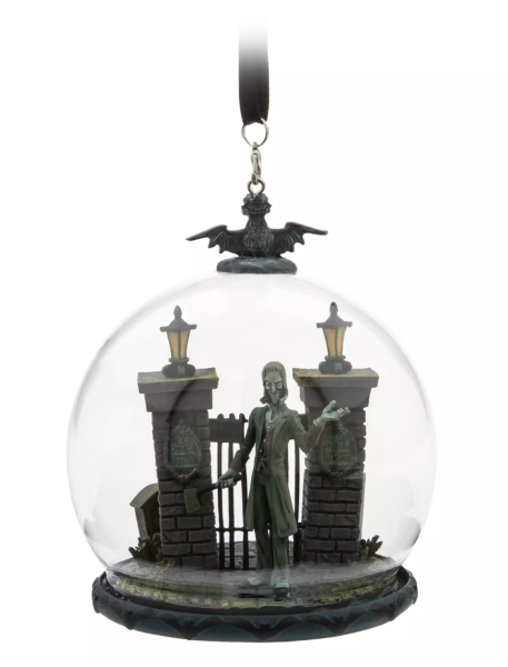 To get the full The Haunted Mansion experience, grab this Ghost Host Ornament that features a glass sphere and bat stanchion crown, Ghost Host and The Haunted Mansion gate, and a bat filigree base.