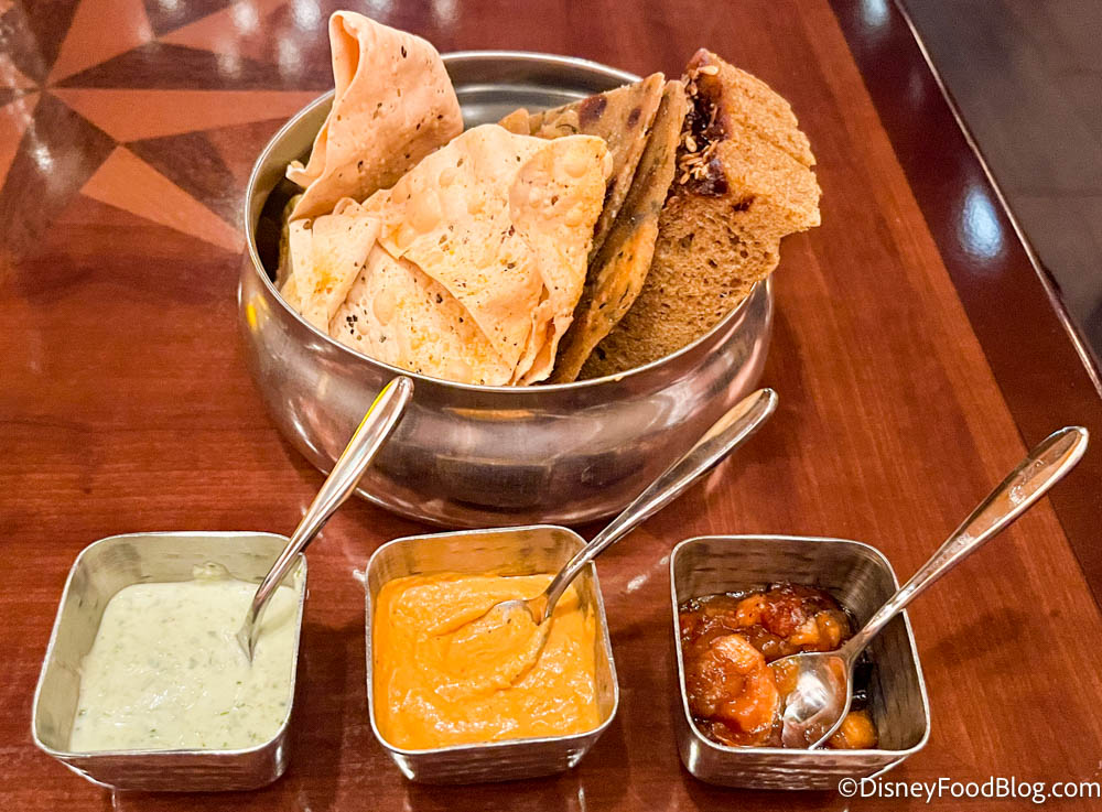 The bread service is excellent at Tiffins Restaurant. The bread is a crispy naan (like a tortilla chip), a pita bread (with an earthy taste), and a traditional bread that tasted like rye or pumpernickel to us.