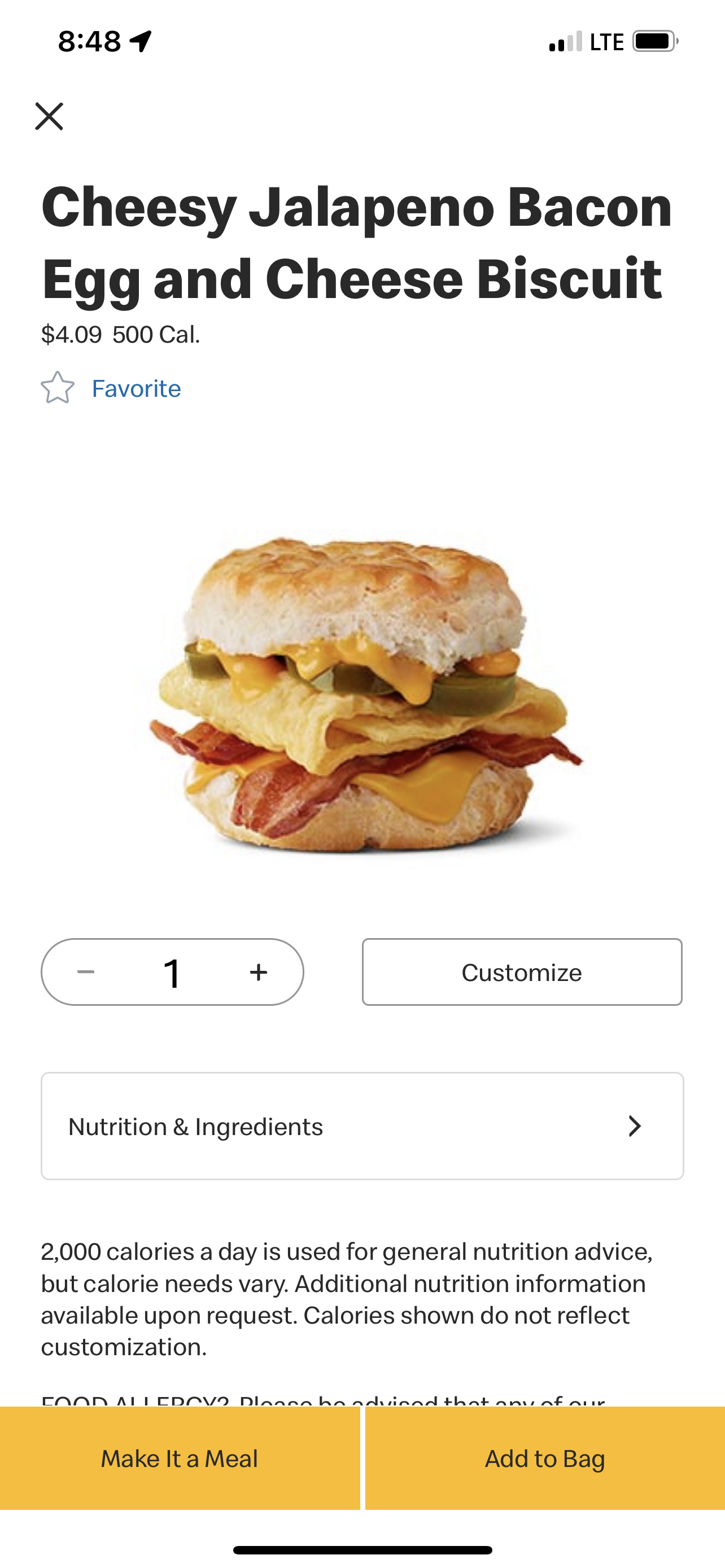 You can also get the Cheesy Jalepeno Bacon Egg and Cheese Biscuit, which is similar to the previous sandwich but with bacon. Oh, and since there’s no jalepeno sausage, the spice will come from pickled jalepenos that have been added to the sandwich. Yum!