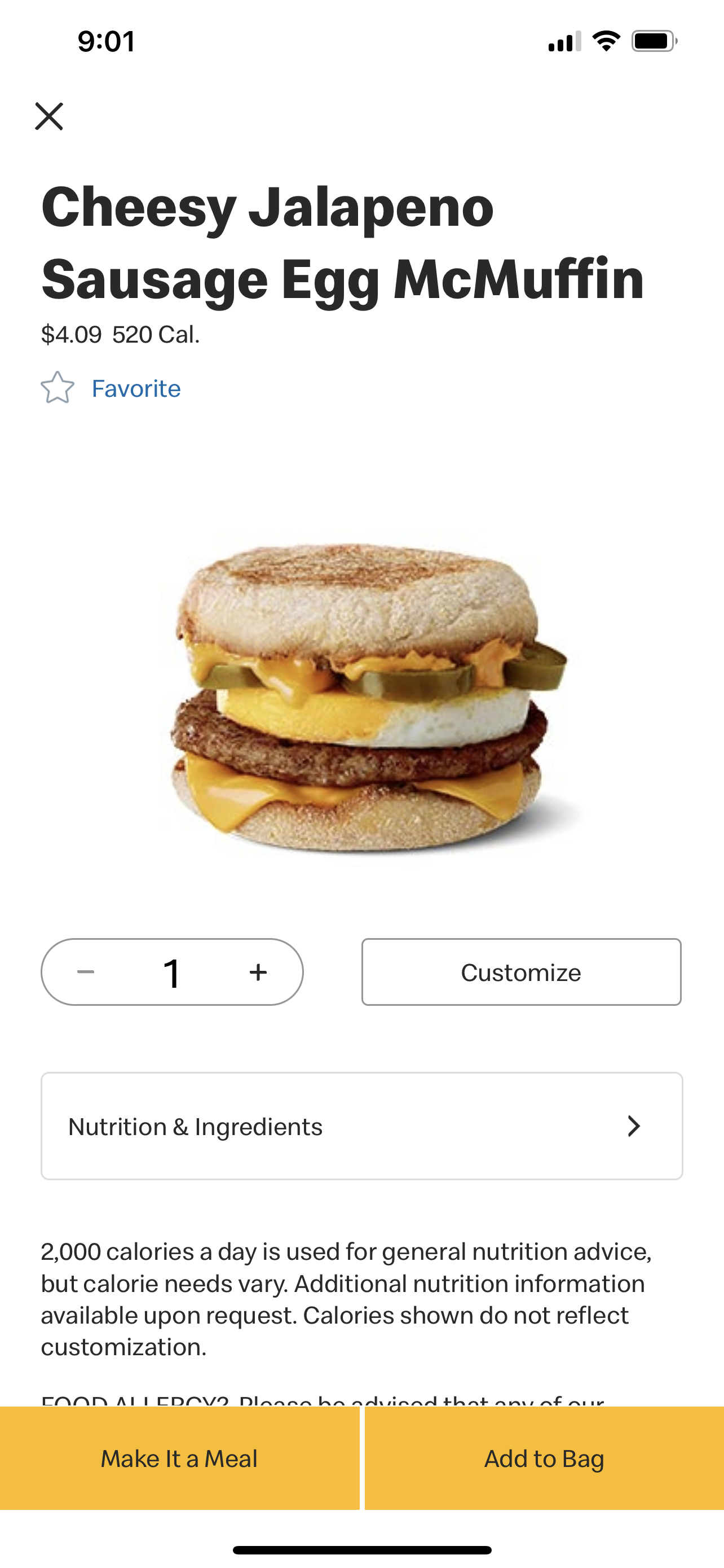 First up, you can get the Jalapeño Sausage McMuffin with Egg, which is “a savory hot sausage, freshly cracked egg, cheesy sauce, and jalapeño slices on a toasted English muffin.”